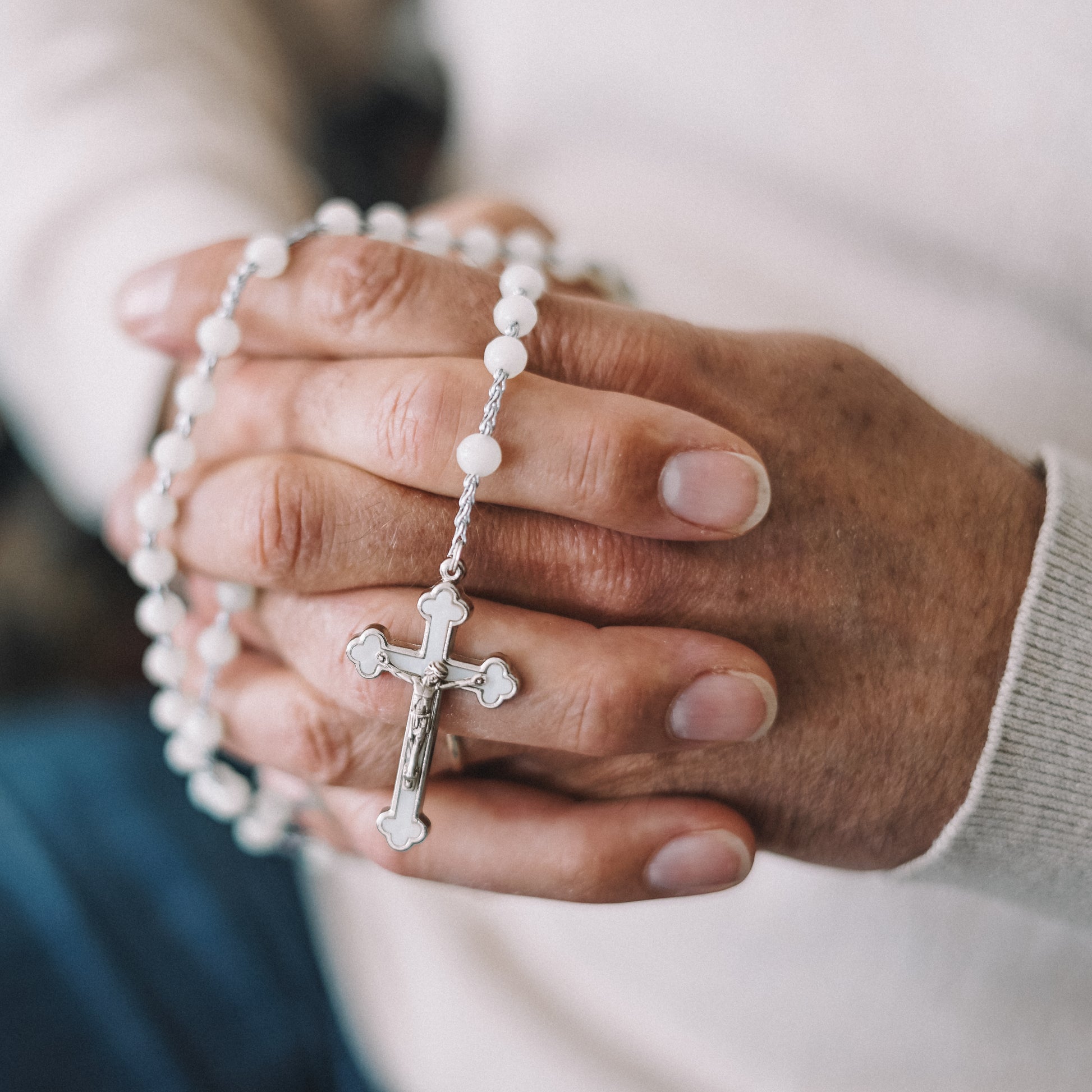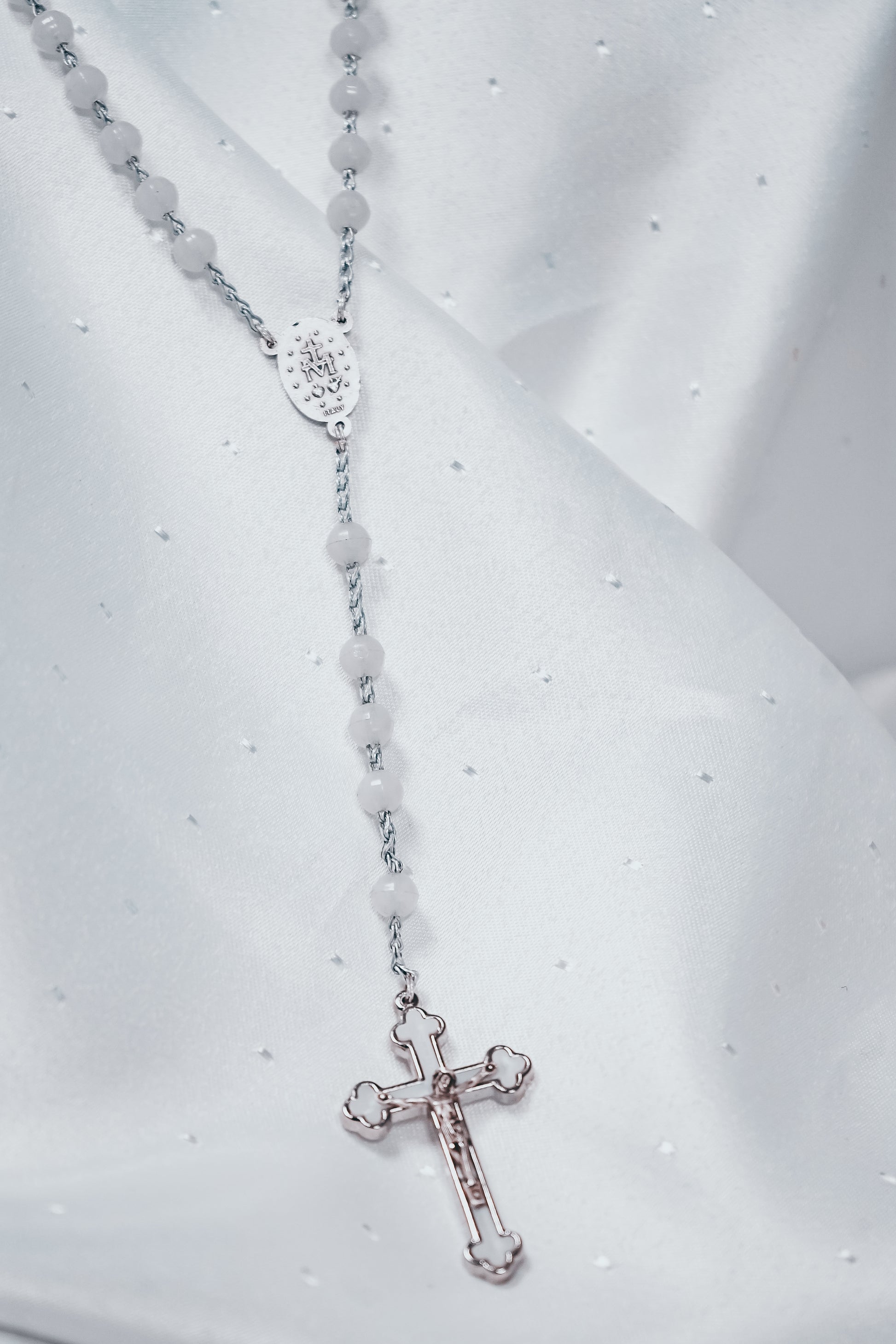 Chapelet sur chaînette avec perle blanches ø 7 mm, longueur au cœur 31 cm, croix avec Christ.